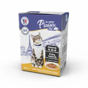 ארוחה גורמה לחתולים – "Casserole Plaisir Chef Dinde" מציעה חוויית טעימה עשירה עם 30% הודו נתחי, בשילוב ירקות מובחרים כמו גזר וקישוא. מתכון מאוזן וטעים במיוחד, מתאים לחתולים סטרלייז.
